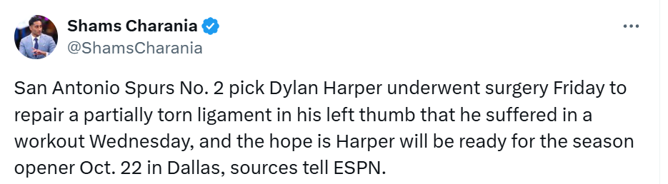 北京时间9月6日,据ESPN名记Shams报道,消息人士向ESPN透露,圣安东尼奥马刺队榜眼秀迪伦-哈珀于当地时间周五接受了手术,以修复他在周三训练中左手拇指韧带部分撕裂的情况,哈珀有望为10月23日在达拉斯举行的赛季揭幕战做好准备。