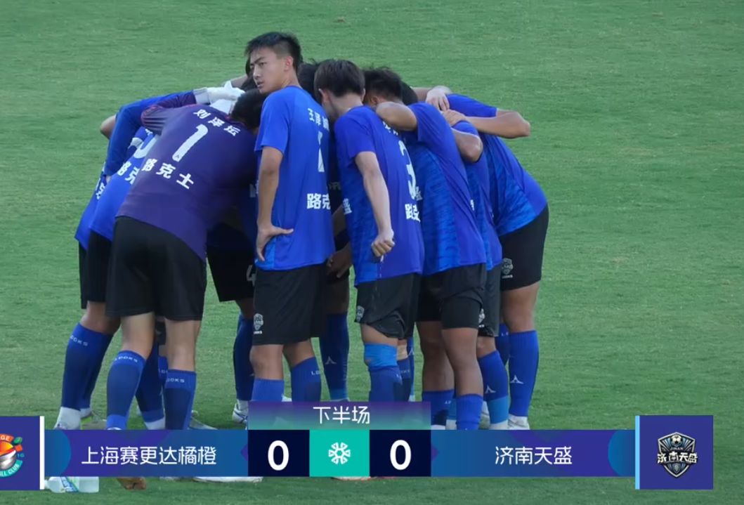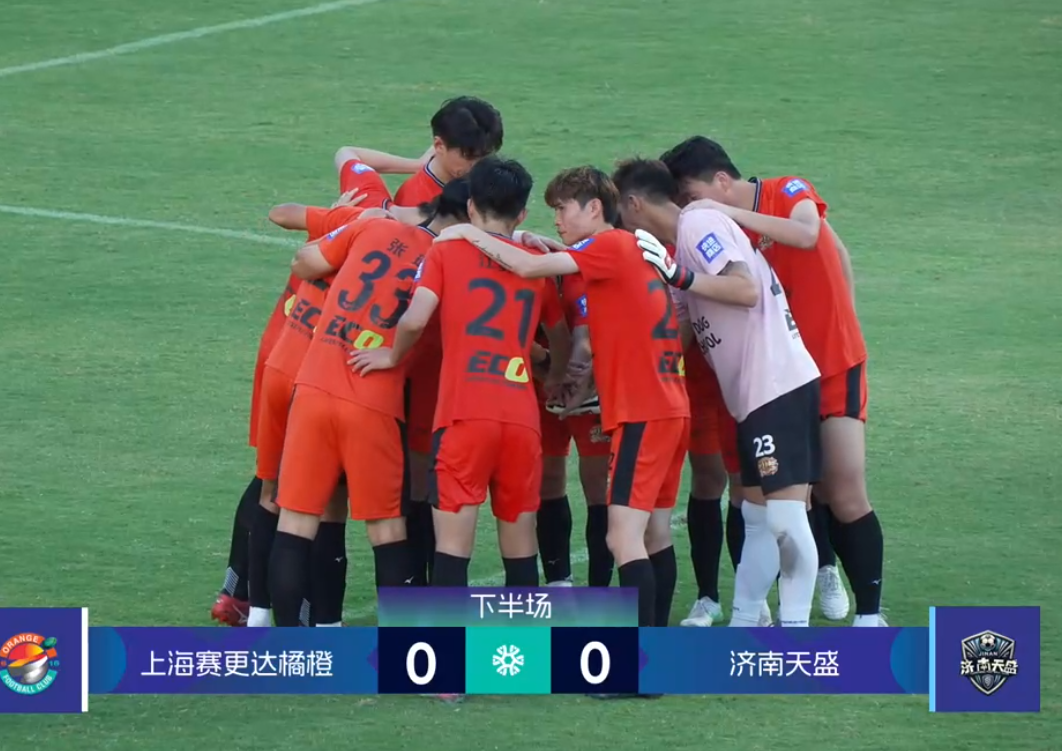 下半场,上海赛更达橘橙安排张璐、徐永乐登场,朱骏被替换下场。此后,他们虽然发动更猛的攻势,但济南天盛门将刘泽坛发挥神勇,加上横梁帮忙,力保城门不失。